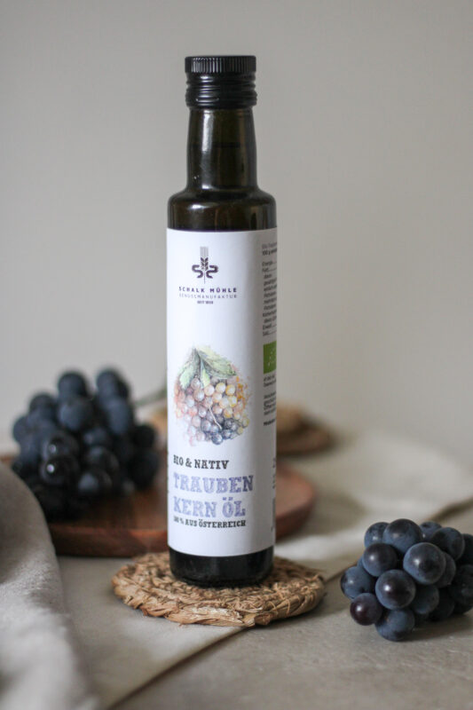 Bio & Nativ Traubenkernöl Flasche mit Weintrauben