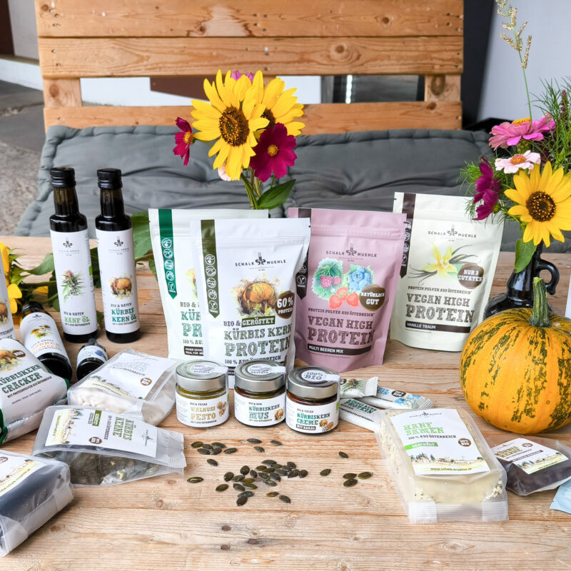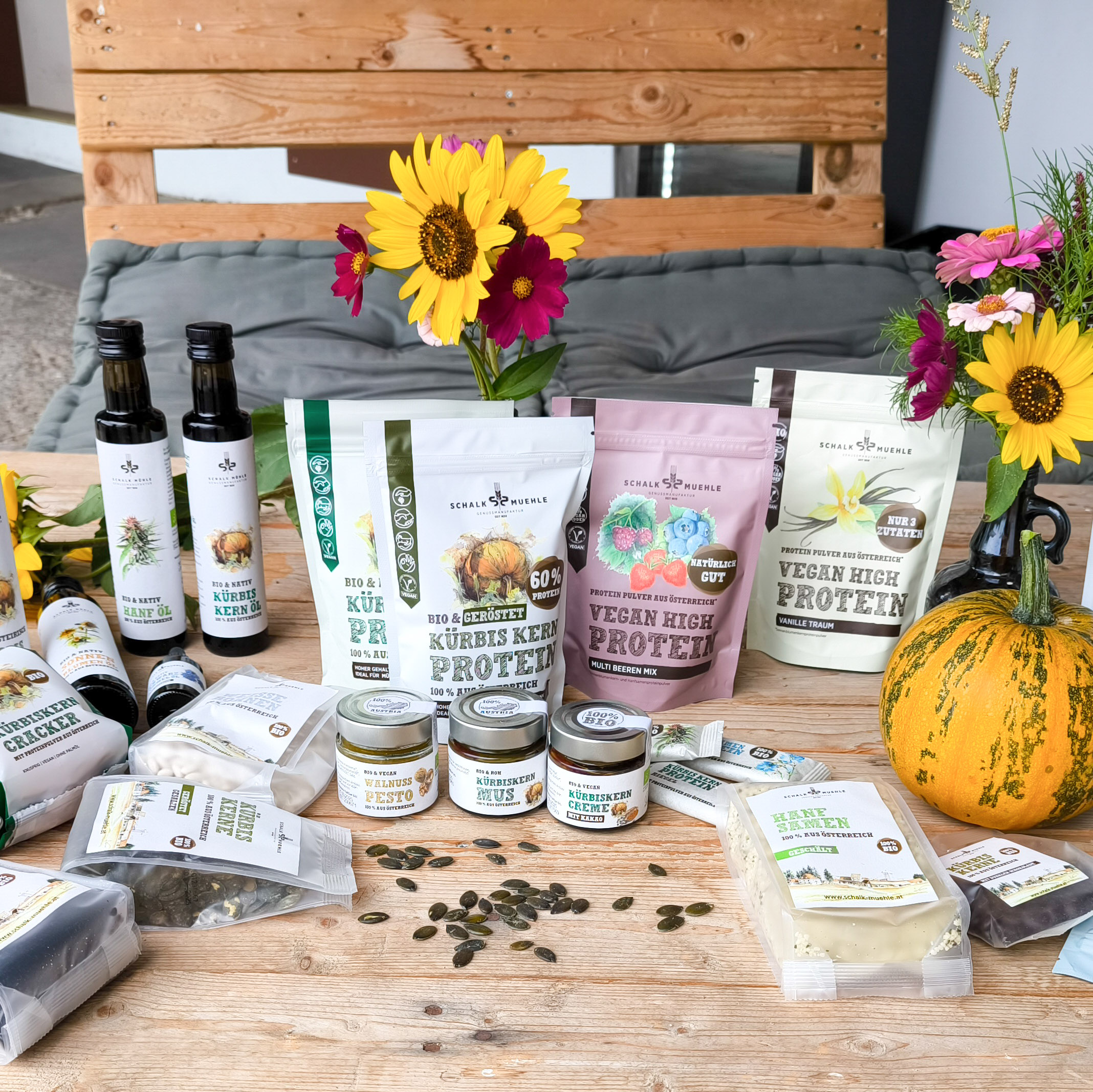Schalk Mühle Produkte - dekorativ präsentiert mit Kürbis und Blumen Arrangements - Schalk Mühle Protein Pulver (Kürbiskern, Beere, Vanille), Schalk Mühle Öle (Hanföl und Kürbiskernöl stehend, Schwarzkümmelöl und Sonnenblumenöl liegend) Kürbiskerncreme und Mus, Walnuss Pesto , Hanfsamen, Kürbiskerne schokoliert, Proteinriegel und Cracker, Kürbiskerne gesalzen und weißte Bohnen liegend