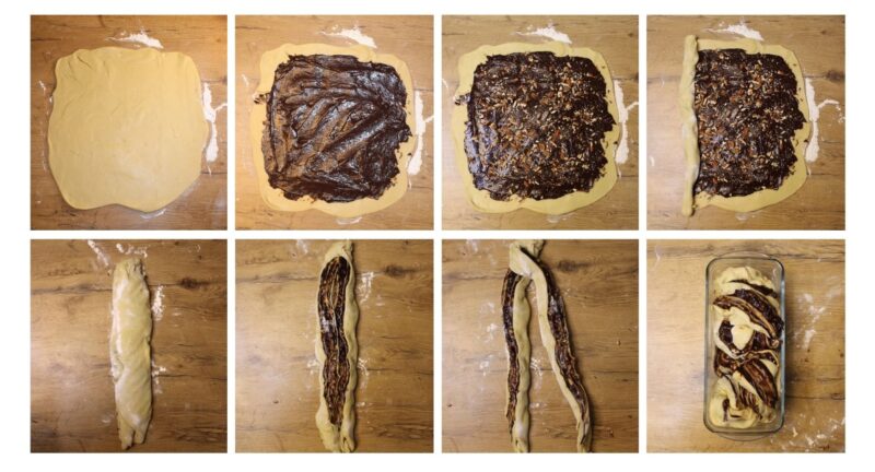 8. Nun wird die Rolle mit dem Messer auseinandergeteilt, dazu bleibt sie jedoch oben zusammen und nach unten hin wird die Rolle in der Mitte durchgeschnitten, sodass die einzelnen Schokoschichten zu sehen sind. Die beiden Stränge nach außen klappen und übereinander flechten, sodass ein Zopf entsteht. Den Teig in die Kastenform geben, abdecken und nochmals 20 Minuten ruhen lassen.