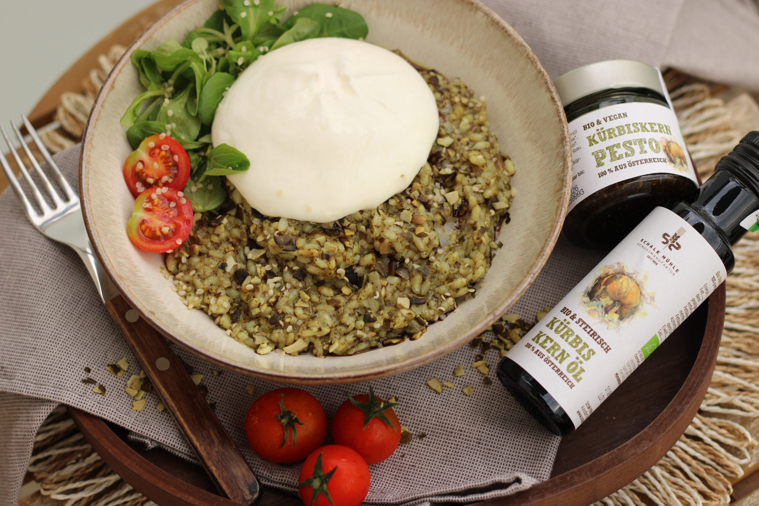 Cremiges Kürbiskern-Risotto mit Burrata, frischem Vogerlsalat und Cherrytomaten, serviert in einer Schüssel – daneben Bio steirisches Kürbiskernöl g.g.A. und Bio Kürbiskern Pesto der Schalk Mühle.