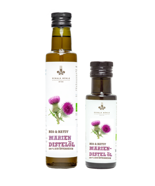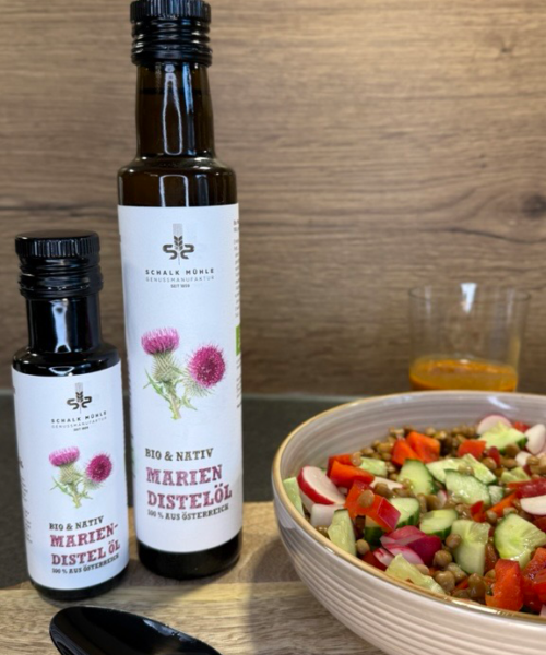 Reines Bio Distelöl in bester Qualität. Die geschälten Samen der Färberdistel werden direkt in unserem Familienbetrieb kaltgepresst. Das Klima in der Region lässt die Färberdistel bestens gedeihen und das kaltgepresste Distelöl hat eine besonders milde Note und verfeinert Salate, Schon- und Rohkost. Sehr gerne verwendet wird unser Bio Distelöl auch zur Hautpflege bzw. für Massagen ist es auch gut geeignet. Wir können es somit absolut empfehlen, in der Küche oder auch in Richtung Kosmetik. Der milde Geruch und der leichte Distelgeschmack machen dieses Öl universell einsetzbar. Du kannst es auch gerne mit anderen Ölen oder Essigen mischen. Entscheide selbst, was für dich am Besten ist.