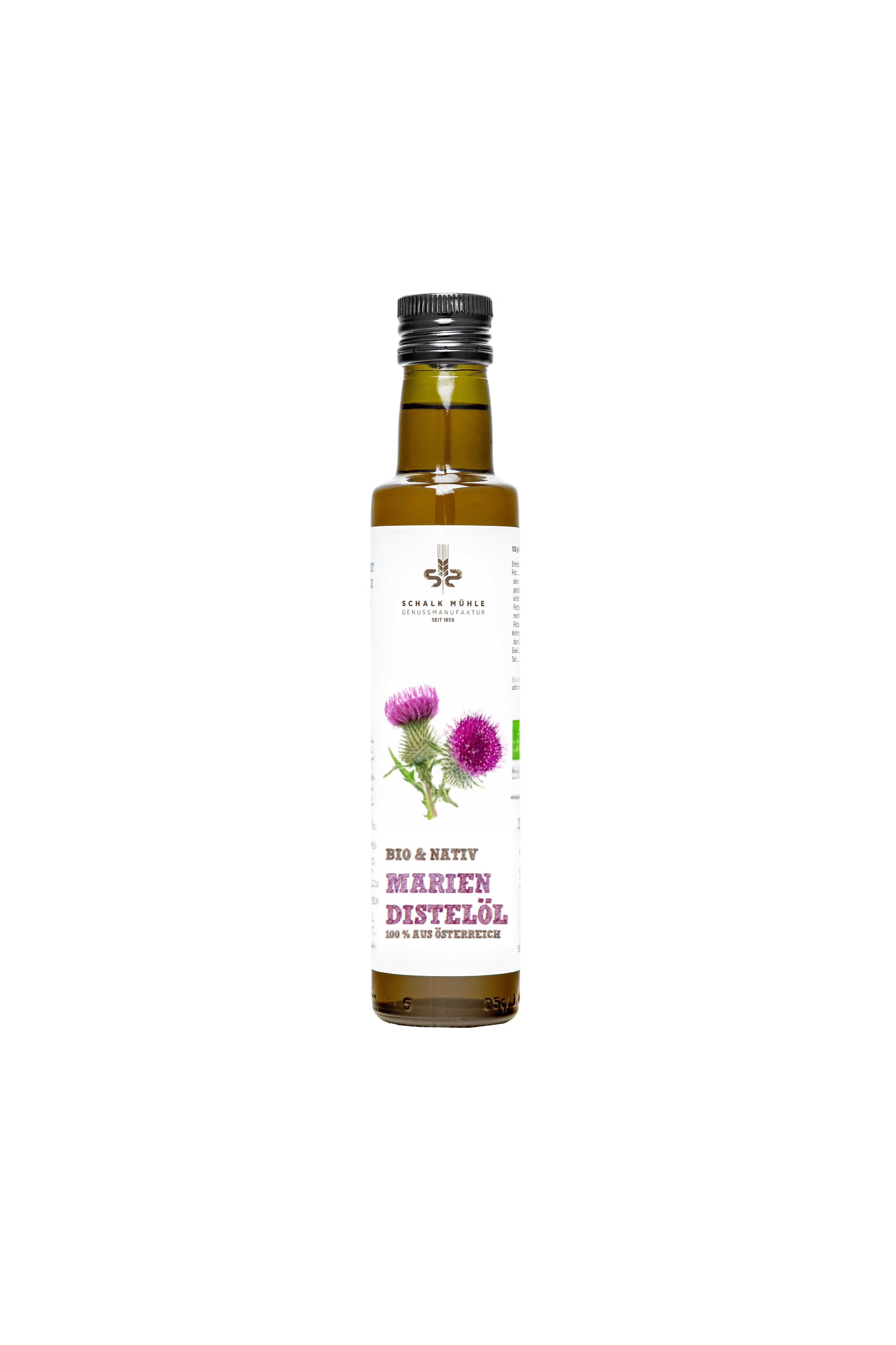 Unser Bio Mariendistelöl wird aus österreichischen Mariendistelsamen gewonnen. Die Mariendistel ist ein traditionelles Bitterkraut aus der Familie der Korbblütler und wird aufgrund ihrer wertvollen Inhaltsstoffe seit der Antike geschätzt. Besonders bekannt ist ihr hoher Gehalt an Silymarin, einer sekundären Pflanzenverbindung, die in der Volksheilkunde als „Leberpflanze“ eine lange Tradition hat.