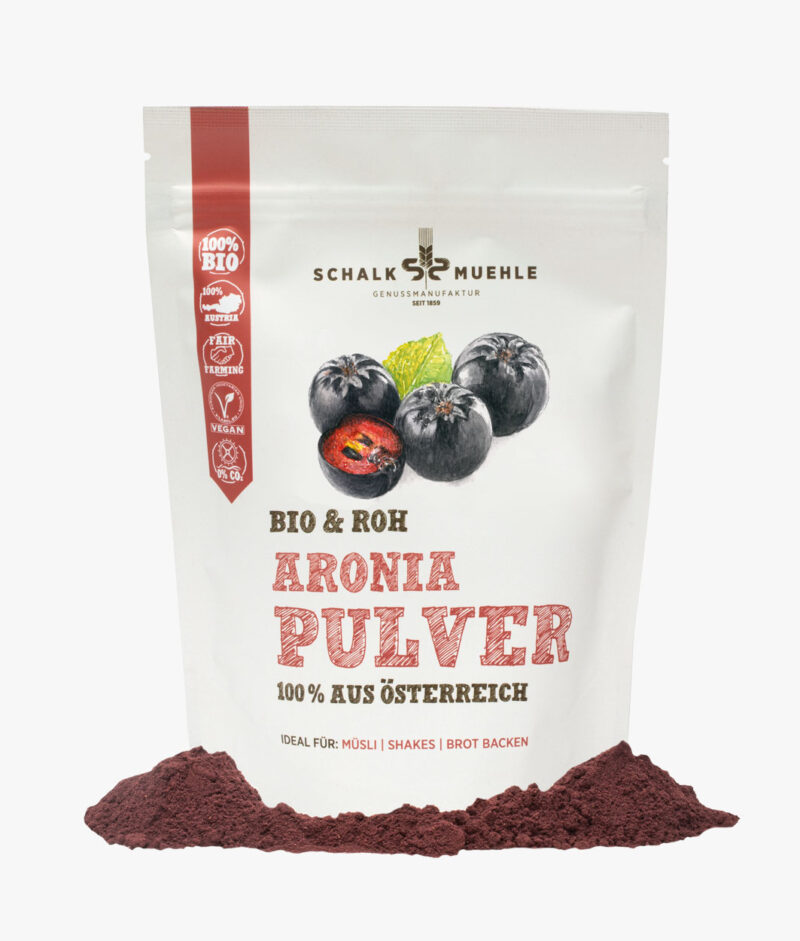 Bio Aronia Pulver ist ein absolutes Highlight und – obwohl als Saftsorte bereits bekannt – noch sehr selten. Durch die partnerschaftliche Zusammenarbeit mit unseren heimischen Bio Landwirten ist es uns möglich, allerfeinstes Bio Aronia Pulver für dich zu mahlen. Das vitaminreiche Pulver hat eine herrlich rote Farbe und eignet sich super für Smoothies. Ein tolles Rezept zu unserem Aronia Pulver findest dazu gleich hier: Bio Aronio Smoothie