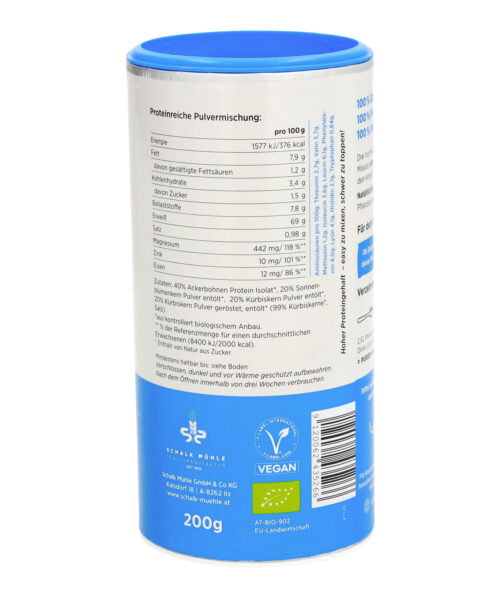 45% Sonnenblumenkern Pulver entölt*, 25% Ackerbohnen Protein Isolat*, 10% Kürbiskern Pulver entölt*, 10% Kokosnussmilch Pulver* (Kokosnussmilch*, Maltodextrin*), 5% Tremella Pulver*, 4% natürliches Vanille Aroma, 1% Vanille Extrakt Pulver*. *aus kontrolliert biologischem Anbau.