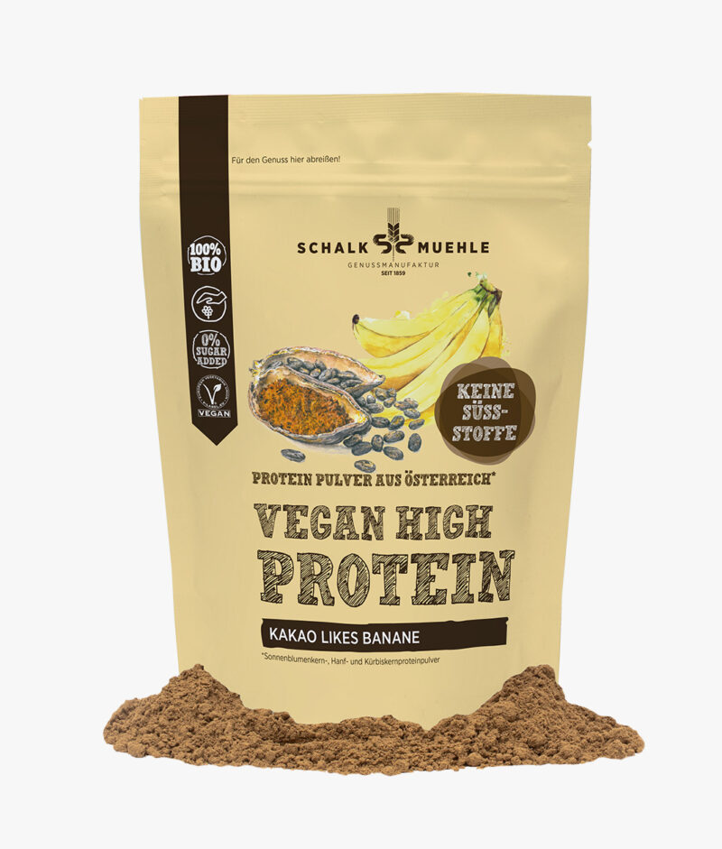 Die Basis unseres Kakao-Bananen Protein Pulver Mixes bilden die pflanzlichen Proteinquellen Hanf, Kürbis- und Sonnenblumenkern. Regionale Proteine vereint mit allerbesten Kakao-und Bananenpulver für einen angenehm süßen Schoko-Bananen Geschmack. Und noch dazu mit einem fantastischen Proteinanteil von 41%. Ob als Shake, im Joghurt, als Backzutat in Muffins, Waffeln, Pancakes, Kuchen oder Pancakes – es schmeckt einfach überall grandios.